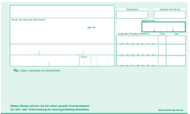 Dieses Rezept wird für nicht verschreibungspflichtige Medikamente ausgestellt, die von der Krankenkasse nicht erstattet werden. Das grüne Rezept dient als Empfehlung des Arztes für ein bestimmtes Medikament und kann in der Apotheke vorgelegt werden, die Kosten für das Medikament müssen jedoch vom Patienten selbst getragen werden.