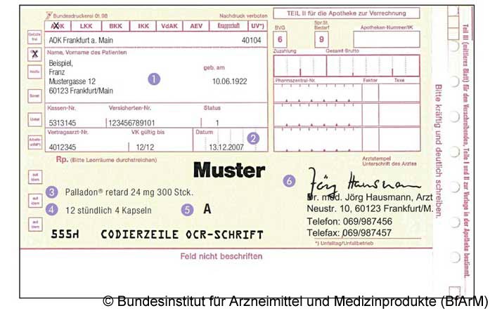 Dieses gelbe Rezept wird für die Verschreibung von Betäubungsmitteln und bestimmten anderen kontrollierten Medikamenten verwendet. Es gibt strengere Vorschriften für die Verschreibung und Abgabe von Medikamenten auf einem BtM-Rezept. Die Gültigkeit nach Ausstellungsdatum beträgt 7 Tage.