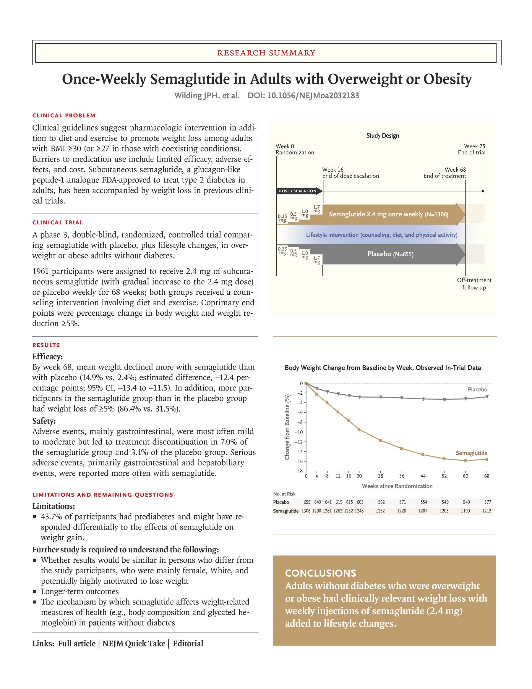 Das Semaglutid-Behandlungsprogramm STEP (Semaglutide Treatment Effect in People with obesity) evaluiert Semaglutid 2.4 mg (ein Glucagon-ähnliches Peptid-1-Analogon) einmal wöchentlich bei Menschen mit Übergewicht oder Fettleibigkeit. Die folgende wissenschaftliche Arbeit hat sich mit den Ergebnissen der Studie auseinandergesetzt:
